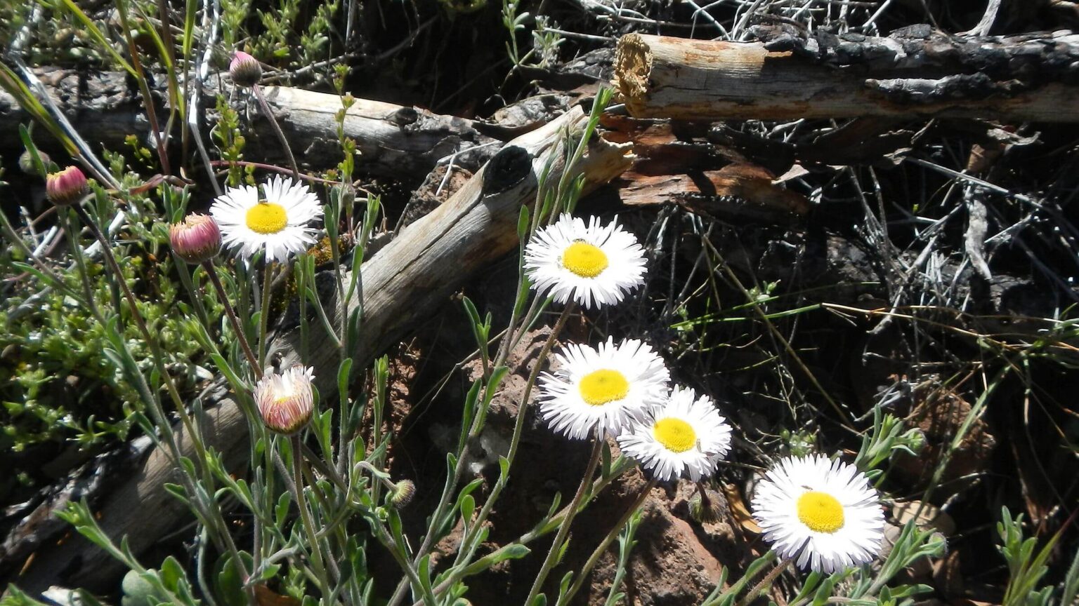 The gentle contour down reminded me of the old trails. But farther down, more downed trees and brush two years after the fire. Corral Canyon was much worse—blown out by a flood event. By 6 p.m. we were nowhere near the spring and had lost the trail. After we made camp, I found it heading up a side canyon on other side of a sediment wall. Next morning, we reached the barren ridges we had seen in 2015, now covered in grass, brush, and flowers.