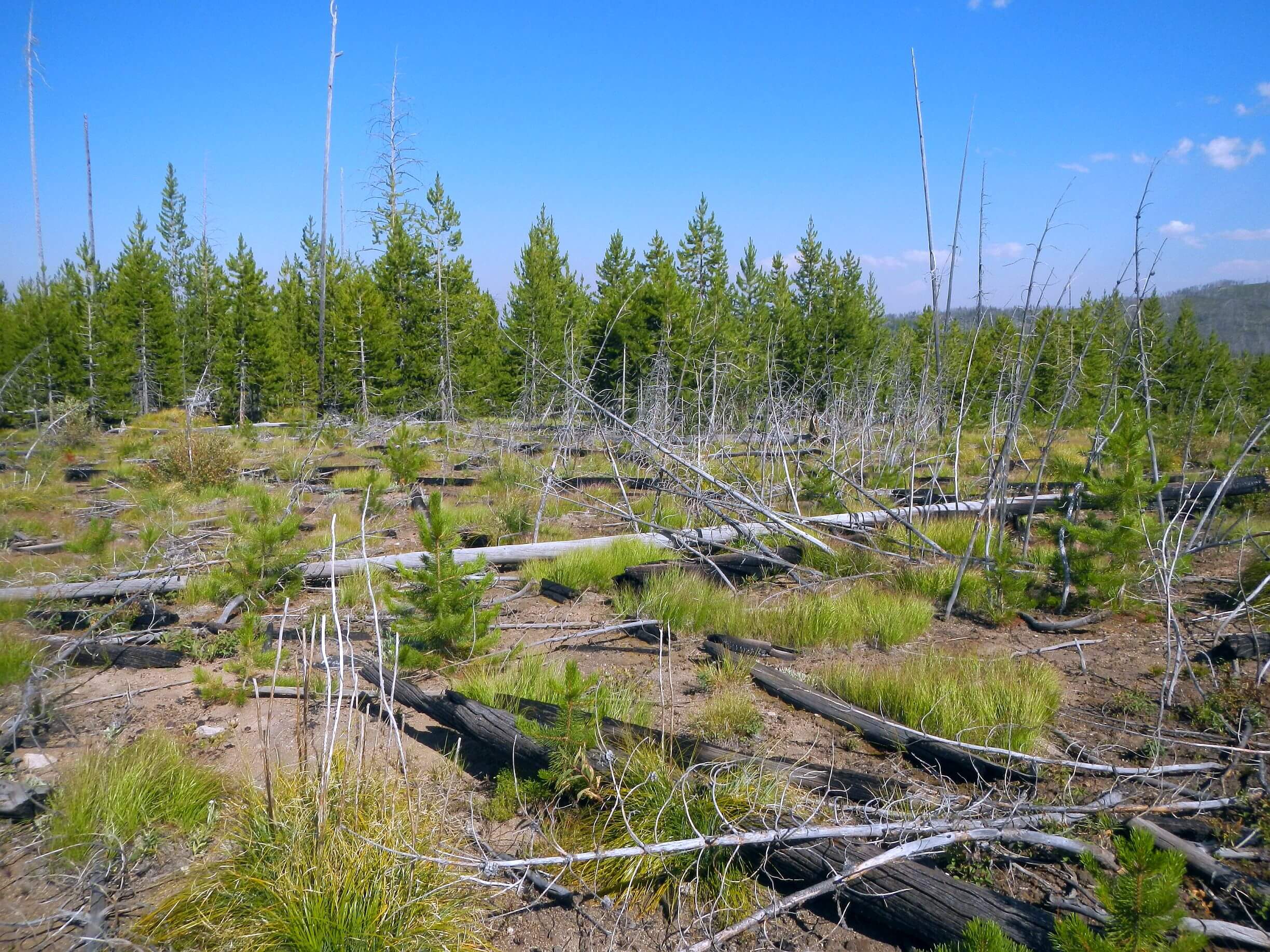 Forests (when not burned) comprised ponderosa and lodgepole pines, Douglas-fir, white fir, spruce-fir, and white bark pine in Frank Church wilderness. Selway transitioned to inland-maritime climate adding more wetter-habitat species such as western red cedar, pacific yew, and grand fir, and subalpine larch. Dense brush over-crowed many trails in burned areas in both wildernesses.